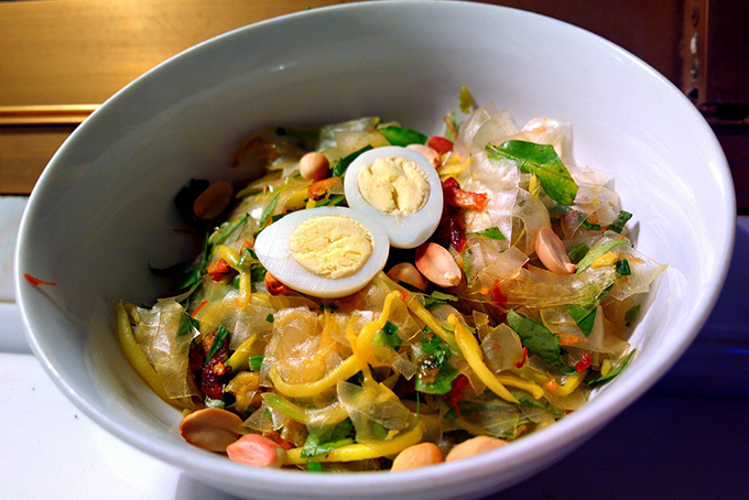 Được biết đến là món ăn vặt Sài Gòn, làm từ bánh tráng phơi sương, cắt từng sợi nhỏ. Khi ăn sẽ trộn cùng với xoài xanh bào sợi, rau răm cắt nhỏ và rắc thêm chút muốn tôm Tây Ninh, vắt một chút nước tắc. Thêm một chút mỡ hành phi với đậu phộng và chút tép rang cho hương vị đậm đà hơn. Ngoài ra thì món này cũng sẽ được ăn cùng trứng cút luộc và vài sợi khô bò.